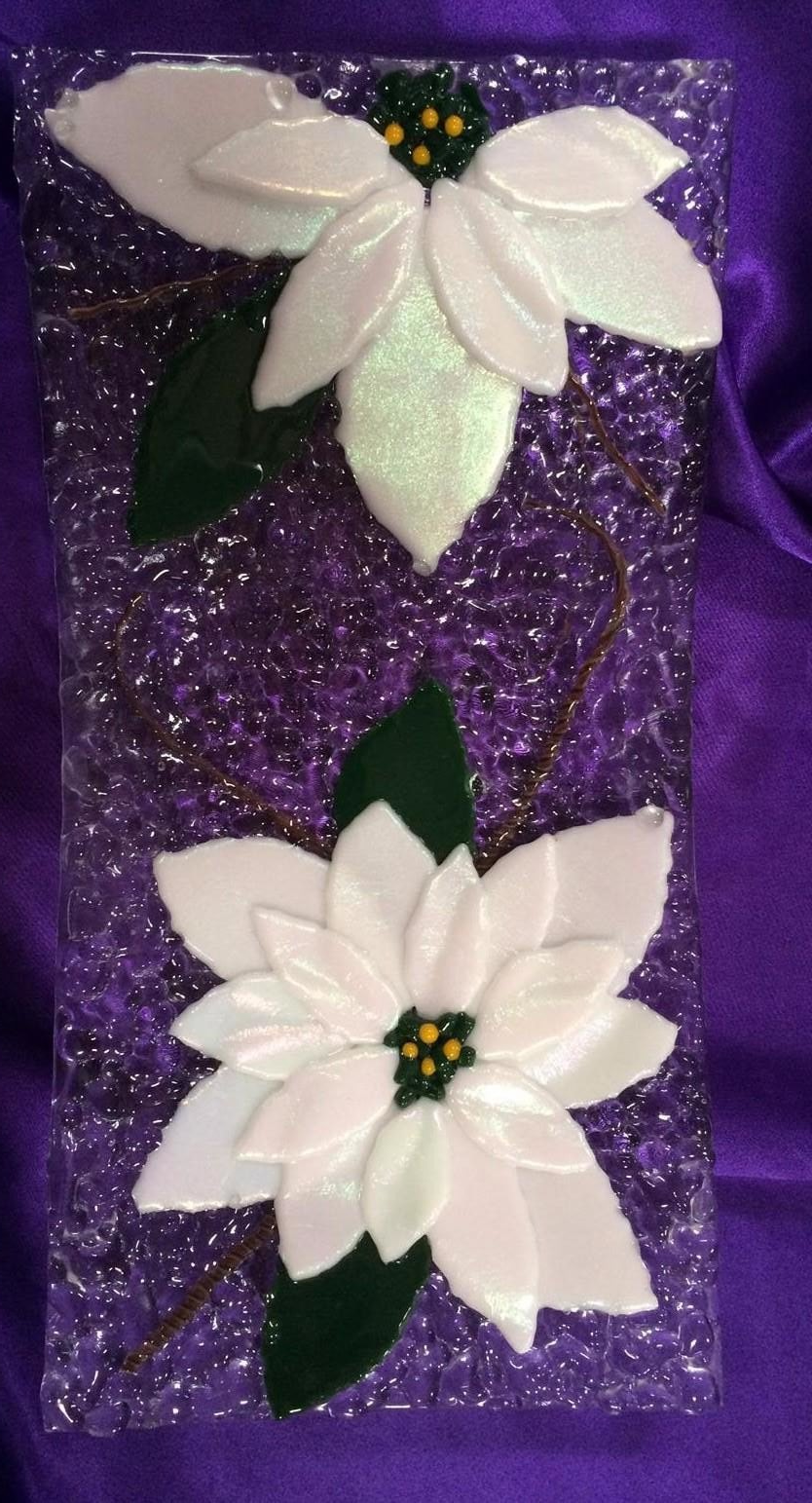 Join us for some holiday cheer as we create this beautiful poinsettia plate. There will be pre-cut white poinsettia petals and green leaves. With mosaic nippers you will create the ruffled edge of the petals and leaves. Use handmade balls, vitrigraph, and frit to finish off your piece. Create a 6" x 6", 6" x 12", or 8" x 8" plate
