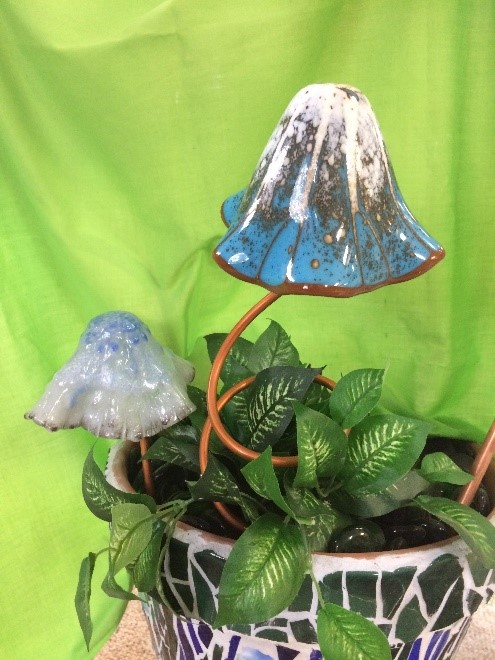 What is the next step after the Garden Mushrooms, the Bell Mushrooms of course. These mushrooms have a great look and shape to them and their stems are copper tubing which will add a great patina to it as the copper ages. In this class, you will make 2 mushrooms, one with reactive glass. If you are not familiar with this look, you will be delighted. Stop by and see what we mean.